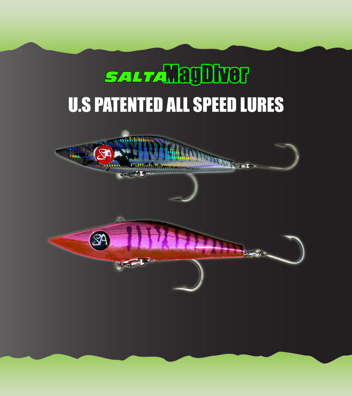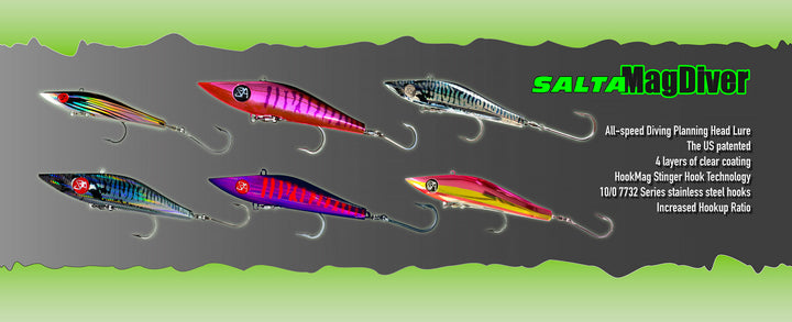 MagDiver All-Speed Lure specifically target Tuna and Wahoo. The HookMag magnetically retains the belly hook in the Stinger position at all speeds until a fish strikes, then, the hook is released.